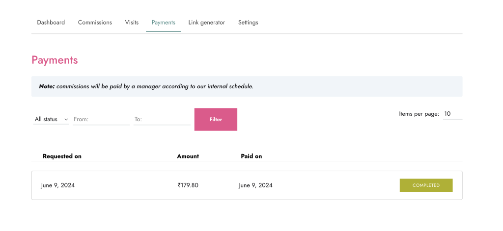 From Payments tab you can see your payouts which has been confirmed and successfully transferred to your account.