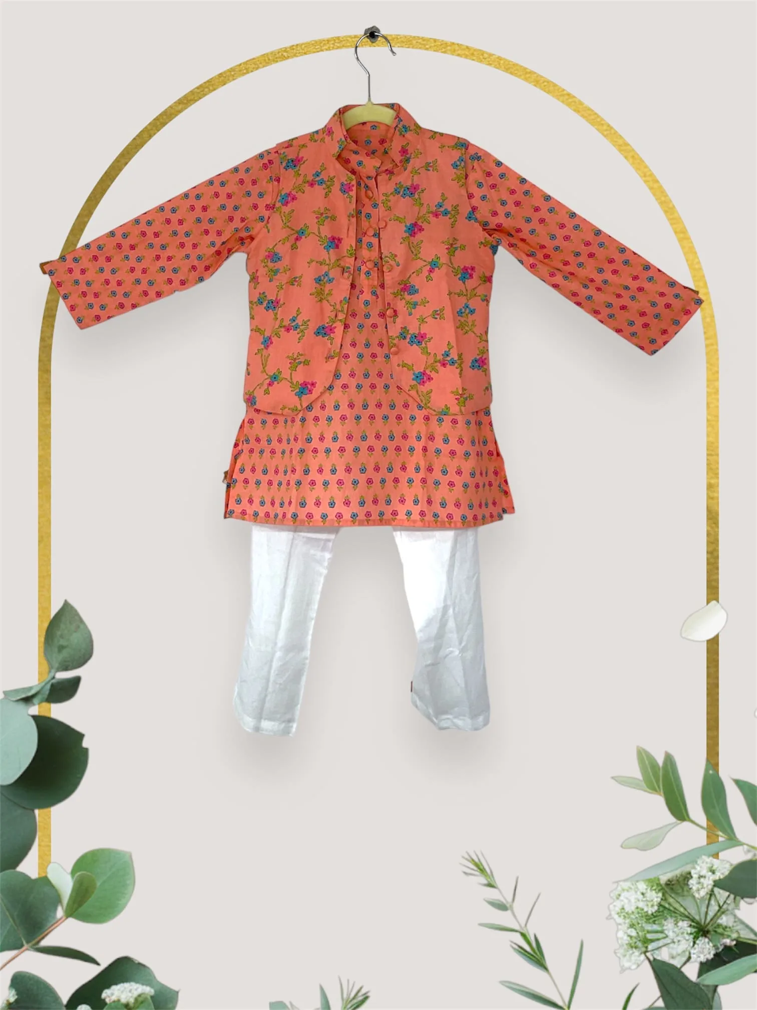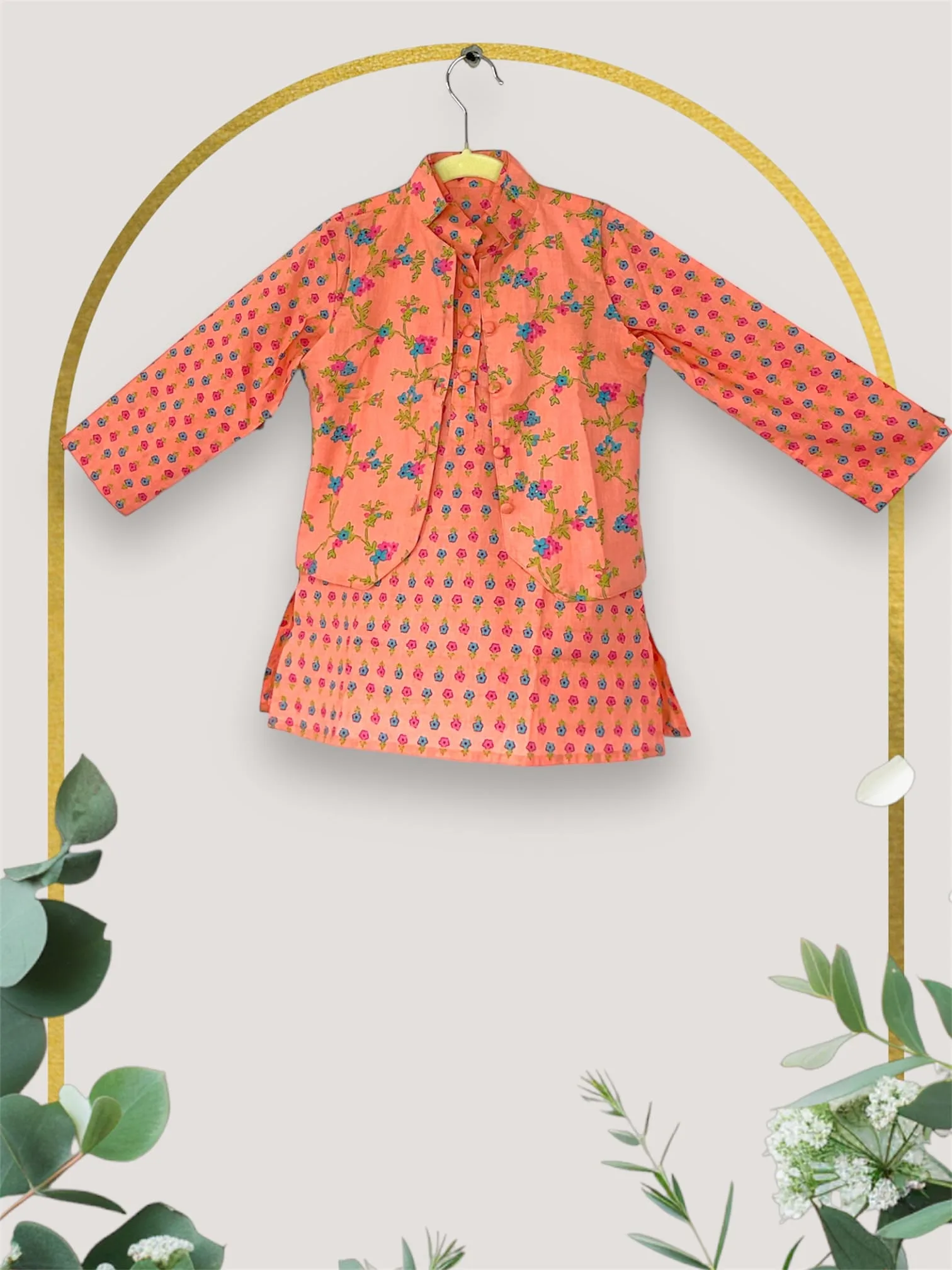 Light up any celebration with this Radiant Glow Kurta Set! FeaturingPeach Floral print, this traditional wear for kids will make your little one shine like a star – perfect for festive occasions! that will last a lifetime! The perfect outfit for Festive occasions to look Handsome. why should girls enjoy all the dressing? Dress up your lil hero in this amazing party outfit.