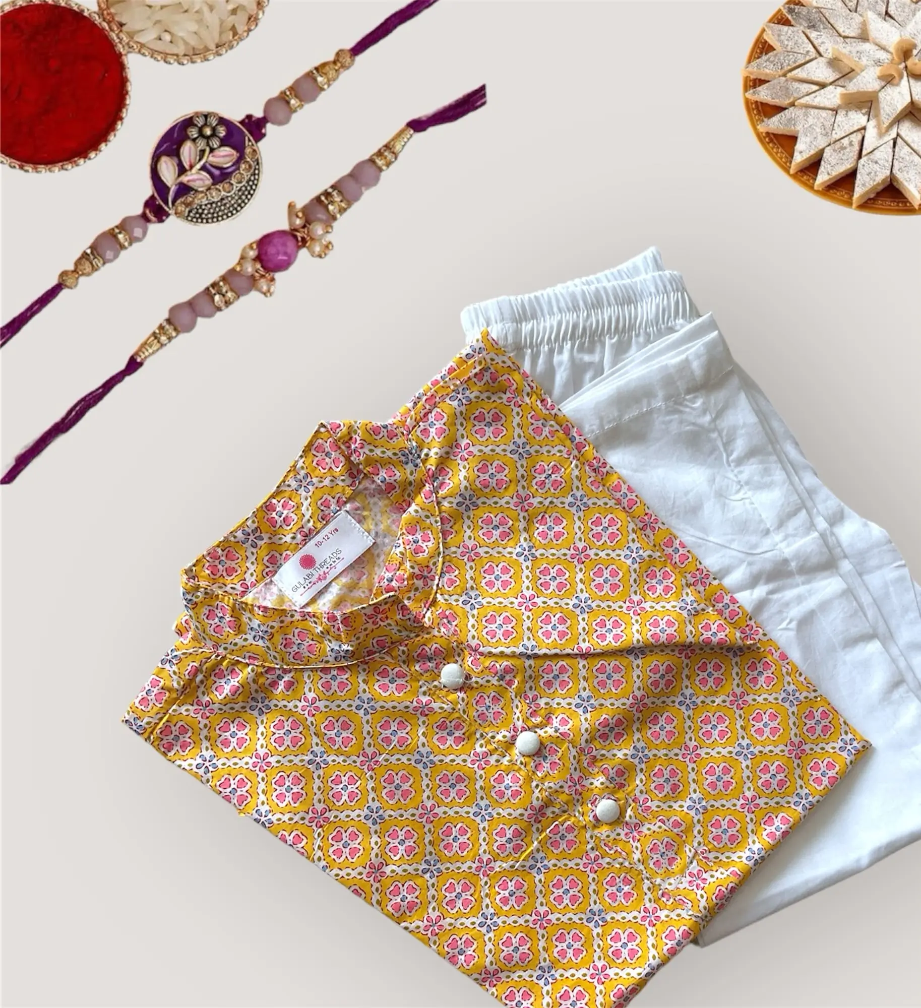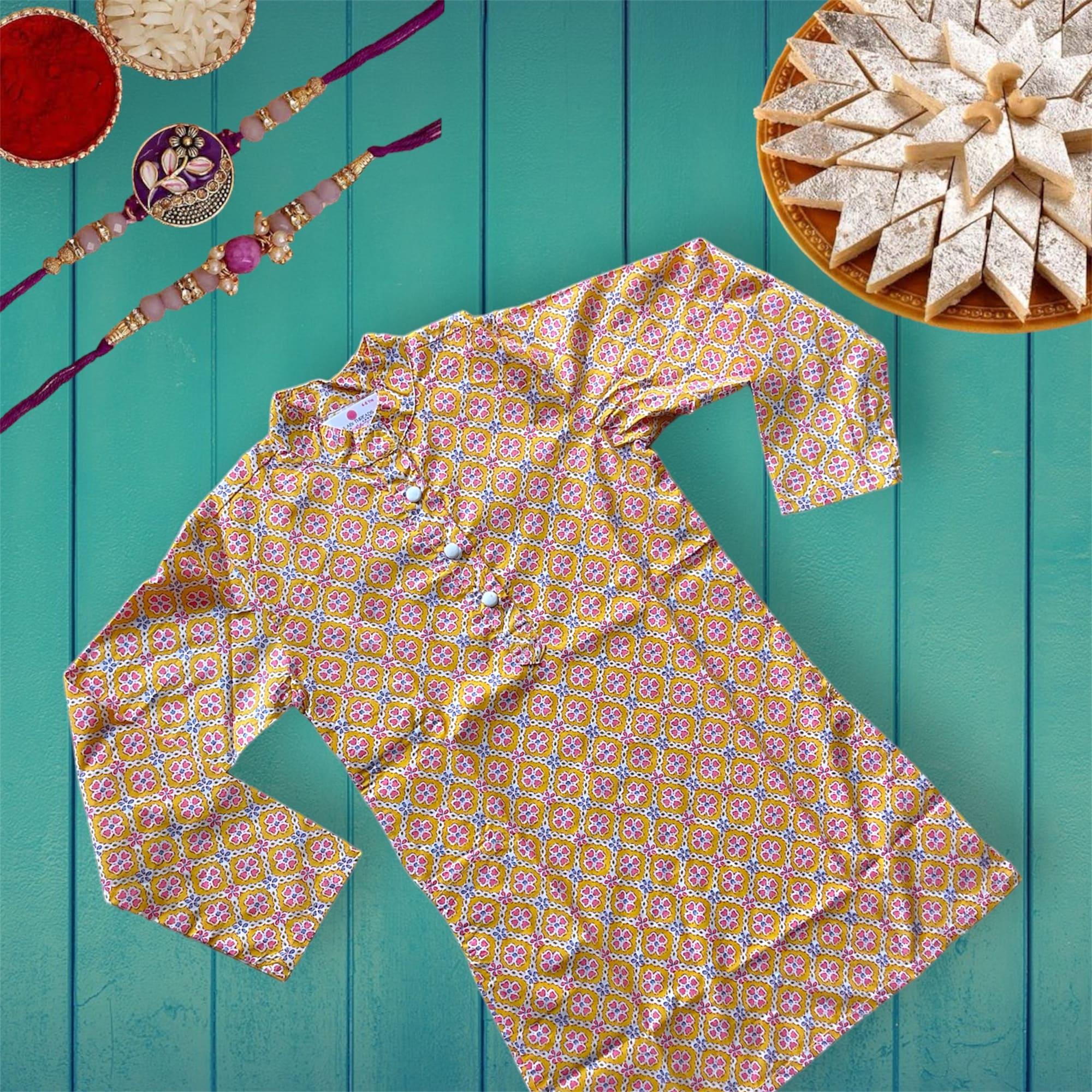 Light up any celebration with this Radiant Glow Kurta Set! Featuring Multicolor Lahariya print, this traditional wear for kids will make your little one shine like a star – perfect for festive occasions! that will last a lifetime! The perfect outfit for Festive occasions to look Handsome. why should girls enjoy all the dressing? Dress up your lil hero in this amazing party outfit.